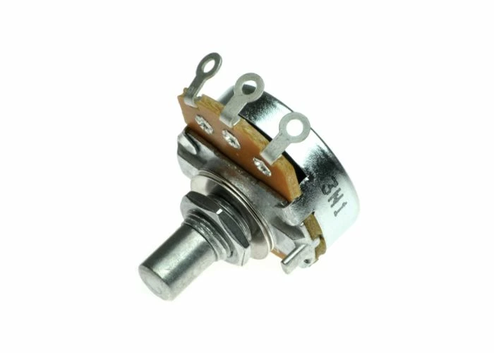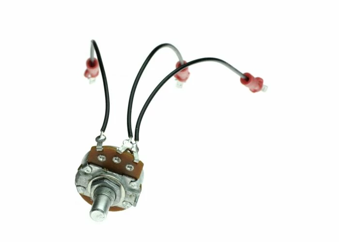 A. There are three ring-tabs on the underside of the potentiometer that need wiring attached. Turn the pot upside down so the tabs are on top and the shaft is facing toward you.